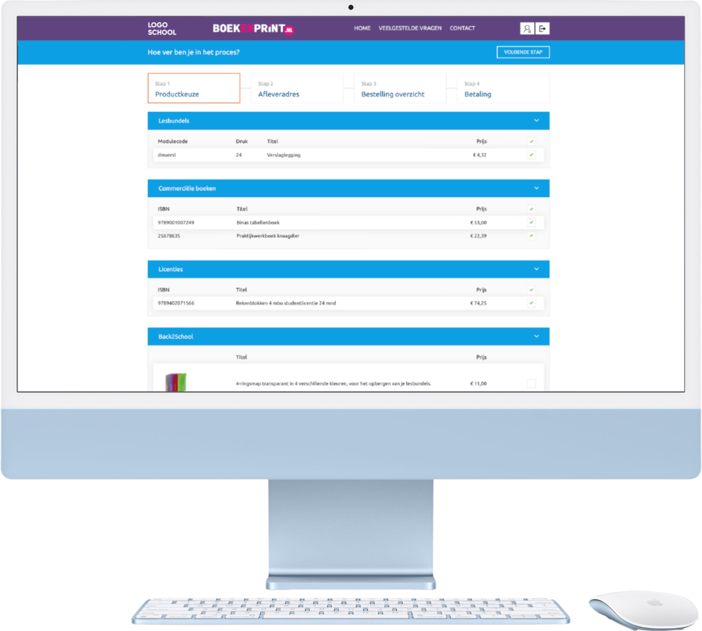 Bij Boekenprint maken we het bestellen van lesmateriaal zo makkelijk mogelijk. Studenten loggen in op hun eigen bestelportaal en zien direct welke boeken en materialen ze nodig hebben. Verplichte leermiddelen staan al aangevinkt en extra keuzemogelijkheden kunnen eenvoudig worden toegevoegd. Met een paar klikken is de bestelling afgerond en wordt het lesmateriaal, indien gewenst, snel en rechtstreeks bij de student thuisbezorgd.